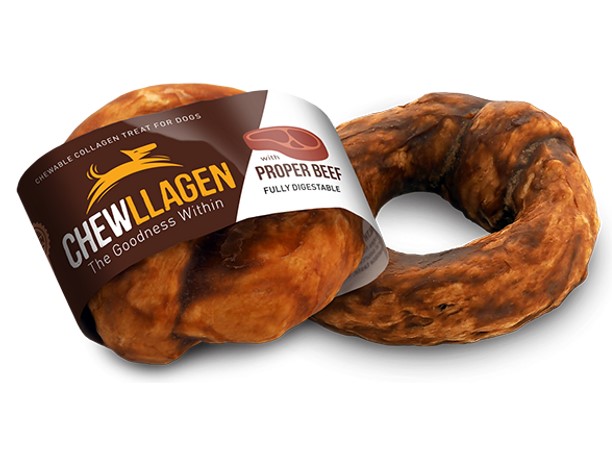 piešķirot tam maizes tekstūru.Kolagēns ir visbagātākais proteīns organismā, un tam ir daudzas svarīgas funkcijas, tostarp kaulu, cīpslu, saišu, ādas un kažokādas augšana un atjaunošana. Dzīvniekam novecojot, tiek ražots mazāk un zemākas kvalitātes kolagēns. Chewlagen, kas galvenokārt sastāv no 1. un 3. tipa kolagēna, stimulē skrimšļa veidošanos, palielina locītavu elastību un mazina locītavu sāpes. Tas ne tikai palīdz jūsu sunim atgūties pēc ilgas pastaigas, bet arī uzlabo viņa muskuļu spēku. Turklāt Chewllagen arī uzlabo jūsu suņa zarnu veselību, padarot to par VESELĪGU IZVĒLI jūsu četrkājainajam draugam.
