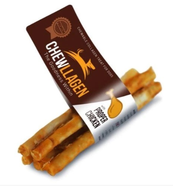 piešķirot tam maizes tekstūru.Kolagēns ir visbagātākais proteīns organismā, un tam ir daudzas svarīgas funkcijas, tostarp kaulu, cīpslu, saišu, ādas un kažokādas augšana un atjaunošana. Dzīvniekam novecojot, tiek ražots mazāk un zemākas kvalitātes kolagēns. Chewlagen, kas galvenokārt sastāv no 1. un 3. tipa kolagēna, stimulē skrimšļa veidošanos, palielina locītavu elastību un mazina locītavu sāpes. Tas ne tikai palīdz jūsu sunim atgūties pēc ilgas pastaigas, bet arī uzlabo viņa muskuļu spēku. Turklāt Chewllagen arī uzlabo jūsu suņa zarnu veselību, padarot to par VESELĪGU IZVĒLI jūsu četrkājainajam draugam.