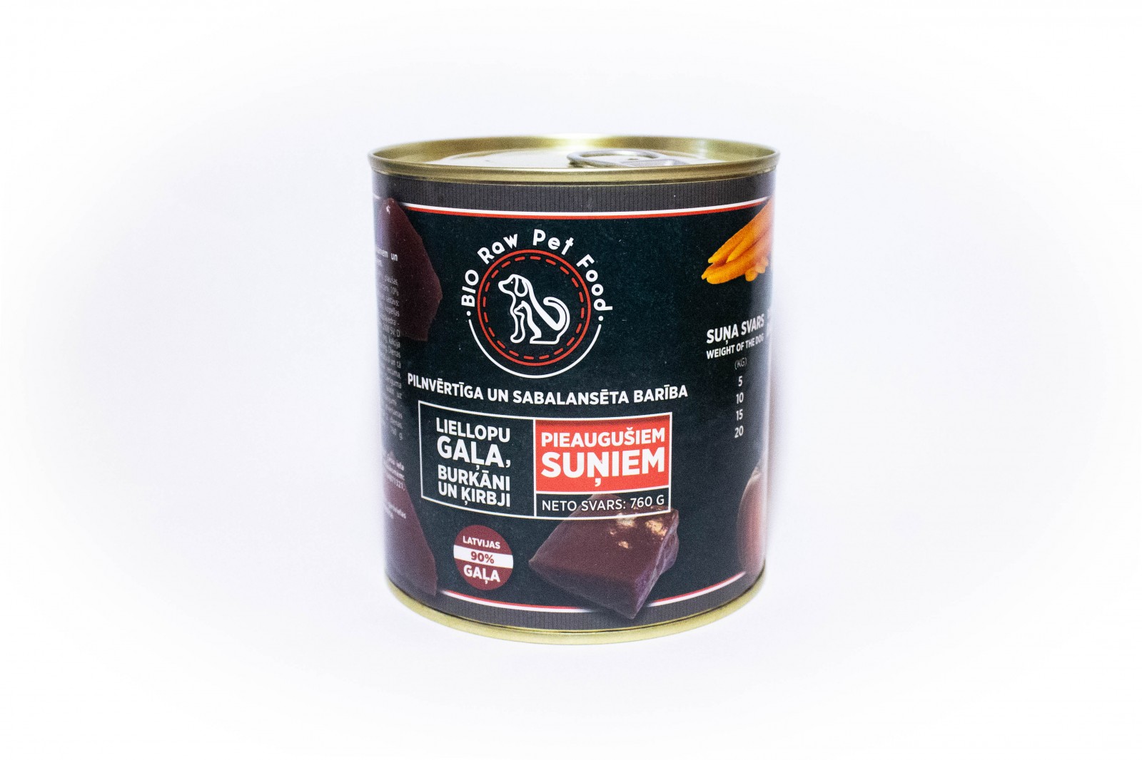 Sastāvs: liellops (gaļa, plaušas, aknas, nieres, liesa, traheja ), dārzeņi (burkāni, ķirbji).