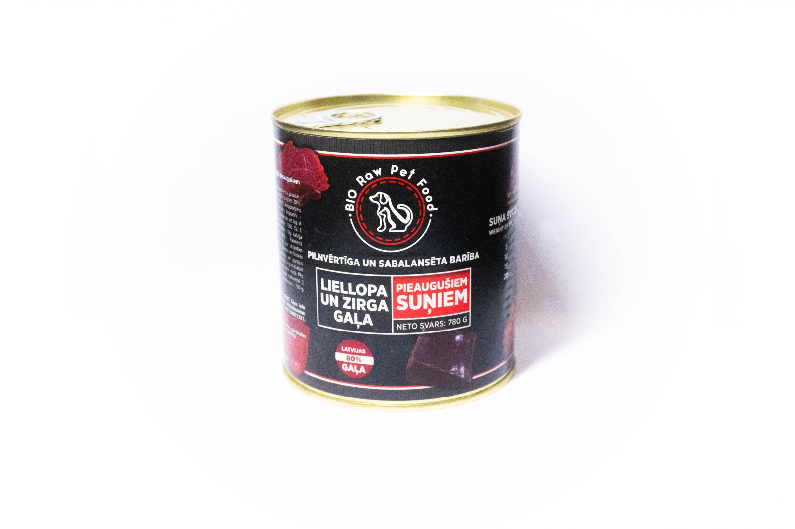 Sastāvs: liellops (gaļa, tesmenis, plaušas, aknas, traheja), zirga gaļa, buljons.